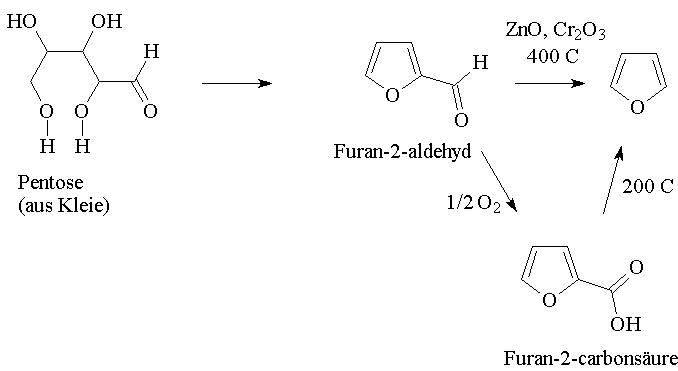 Furan-2-aldehyd (Furfural) entsteht in technischem Maßstab durch säurekatalysierte Wasserabspaltung aus Pentosen, z. B. bei der Destillation von Kleie (lat.: furfur) mit verdünnter Schwefelsäure. Furfuran selbst wird technisch durch thermische Decarbonilierung des Alfehyds gewonnen. es entsteht auch bei der Decarboxilierung der Furan-2-carbonsäure (Brenzschleimsäure).